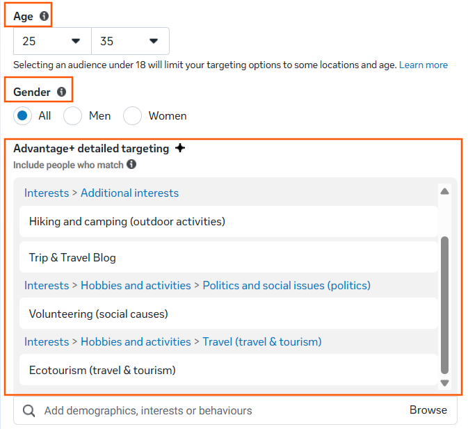 - Behaviour: Behavioural targeting involves tracking how people behave online. For instance, if your persona frequently watches travel videos or engages with content about eco-tourism, you can target ads related to eco-friendly products or travel experiences.