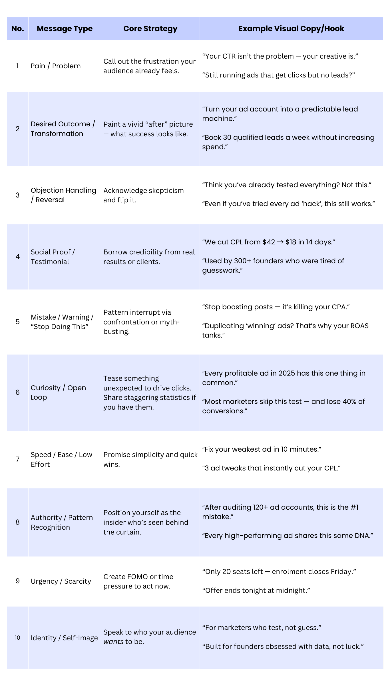 Stuck on what to write? Here’s my prompt to get ChatGPT to brainstorm ad image copies: “Write short on-image ad copy ideas (under 12 words) for my [product/service] using these 10 message angles — Pain, Outcome, Objection, Proof, Warning, Curiosity, Speed, Authority, Urgency, and Identity — in a tone that fits [my audience].”
