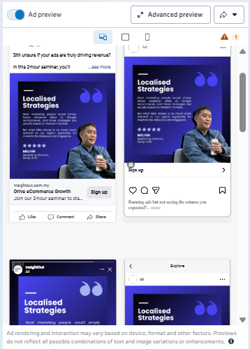 - Use Ad Preview in Ads Manager to see how your ads will appear across both Feed and Stories placements. This tool allows you to double-check your creatives and ensure they look great on all devices.