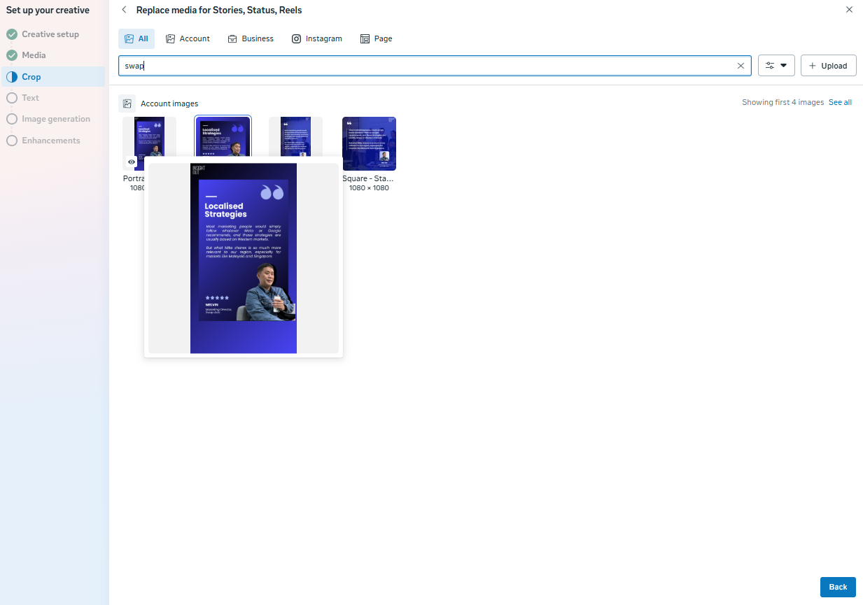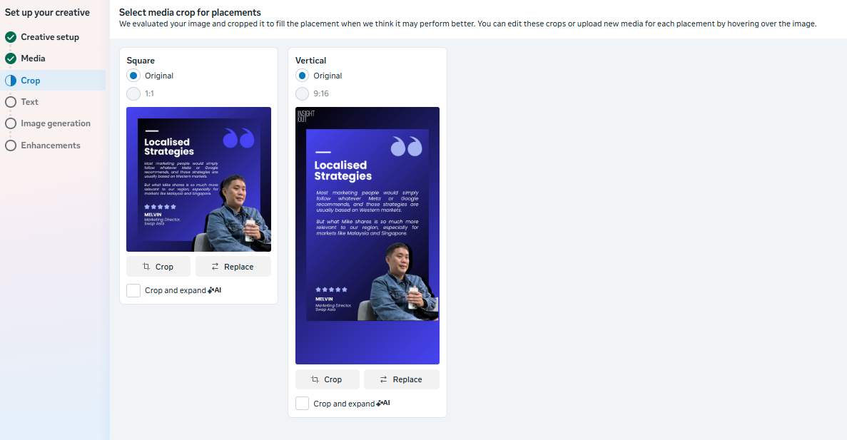 Once your creative assets are ready in both square and vertical dimensions, you can easily upload them into separate placement groups in Meta Ads Manager.